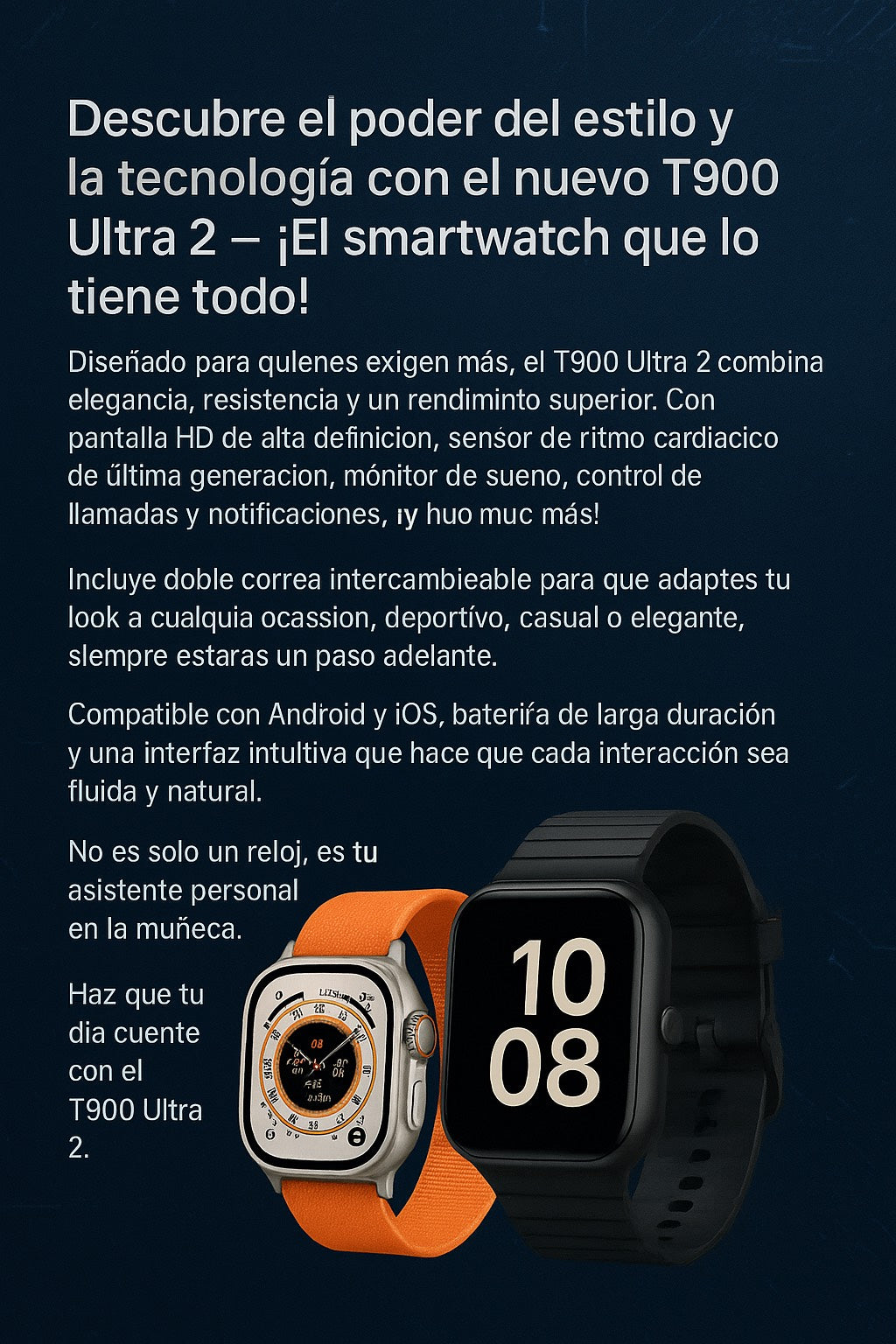 EL RELOJ INTELIGENTE T900 ULTRA DOBLE CORREA ES EXCELENTE PARA QUE PUEDAS LEER TODAS LAS NOTIFICACIONES DE TUS REDES SOCIALES, MANTENERTE CONECTADO CON LA CANTIDAD DE CALORIAS QUE QUEMAS EN EL DIA Y PODER CONTAR TODOS TUS PASOS DEL DIA.